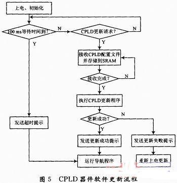 (2)导航计算机系统必须包含支持一个UART通信接口,用于接收CPLD的配置文件。此UART接口不能由CPLD参与控制,以避免CPLD某次编程失败后,该UART通信口不再可用的问题。