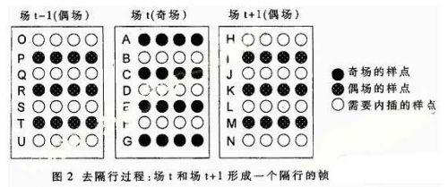 实际上为实现去隔行已经提出了很多简单的滤波器。一种选择是用同一场中的垂直内插值,这是个一维二倍上转换的问题。理想的垂直滤波器是一个半带低通滤波器。然而,这个滤波器要求无限长度冲击响应是不可实现的。实际应用中使用的是短得多的滤波器。最简单的是行平均,它用丢失行的上一行和下一行的平均来估计该丢失行。在图2中,对于第t场,D=(C+E)/2。由于没有使用时域滤波,所以它沿时间频率轴具有全通特性。为了改进性能,另一种选择是使用更长的垂直内插滤波器,其频率响应更接近理想的半带低通滤波器。对于第t场的行,满意的内插方法是D=(A+7C+7E+G)/16。以上两种方法都是只用了垂直内插。一种替代方法是使用时间内插。值得注意的是,对于一场中每个丢失行,在同一帧的另一场中有一个对应行。一个简单的时间内插方案是复制此对应行,即D=K,J=C。这种方法称为场合并。因为每一个去隔行帧都由合并两场获得,但是这两场的时间内插是相反的(对于某些特殊图案可能会产生视觉人为失真)。由于只在时间方向上进行了滤波,因此在垂直方向上是全通的。