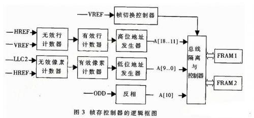 帧存控制器的设计对于实现两种不同视频系统之间的图像信号的存储、采集和显示显得非常重要。为了保证数据处理与采集的连续,设计中使用了两组帧存储器(FRAM1、FRAM2),由于数字化的图像每帧大小为640×480=307200(16bit)共300K×16bit的数据量,笔者使用每组512K×16bit的静态存储器,存储时间为12ns,可以保证快速地读出和写入图像数据。图3为帧存控制器的逻辑框图。