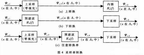 应用栅格理论几何变换处理过程可以按下面方式进行描述:给定一个定义于点阵Λ1上已采样信号,需要产生一个定义于另一个点阵Λ2上的信号。如果,Λ1中的每一个点也在Λ2中,那么此问题是上转换(或内插)问题,可以先将那些在Λ2中而不在Λ1中的点添零(即零填充),然后用一个作用于Λ2上的内插滤波器估计这些点的值;若Λ1)Λ2,即为下转换(或抽取)问题,可以简单地从Λ1中取出那么也在Λ2中的点。然而,为避免下采样信号中出现混叠,需要对信号进行预滤波,以将其带宽限制到Λ2*的沃格纳晶体。上转换和下转换的过程示于图4(a)、(b)中。更一般的情况,如果Λ1和Λ2互相不包含,就需要找到另一个即包括Λ1又包括Λ2的点阵Λ3,可以先将Λ1上采样到Λ3,然后再下采样到Λ2。此过程示于图4(c)。图4(c)中Λ3中的中间滤波器完成两个任务:首先,内插出Λ1中漏下的采样点;其次把Λ3中的信号频谱限制于Λ2*的沃格纳晶格。