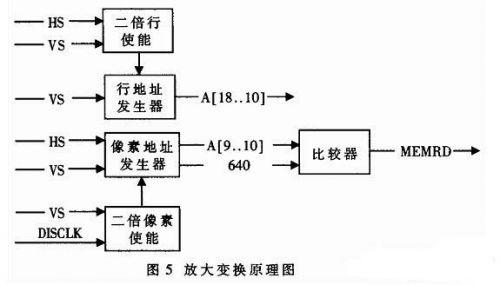 对于本系统具体的4倍放大要求,将行同步信号先进行二倍行使能运算,并利用场同步信号对该寄存器进行复位,将生成后的二分频行同步信号控制行地址发生器,也就是产生帧存储器所需的高位地址;类似地利用像素时钟、行同步信号和场同步信号就可以得到所需的低位地址。由于在帧存控制器向帧存储器写入数据时采用了一行点1024个位置的办法,所以在低位地址后连接了一个比较器,当产生的低位地址小于640时,帧存储器的读信号有效,否则无效,以保证不会混叠入无效的数据。