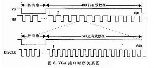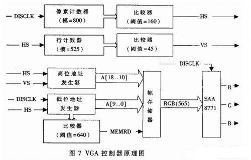 DISCLK为视频显示时钟,频率为25MHz,首先输入到模等于800的像素计数器中,输出的计数值与一个预先设好的比较器进行比较,当计数器的值大于160时,输出高电平,反之输出低电平,作为行同步信号;同理,利用一个模等于525的计数器对行同步信号进行计数和一个阈值为45的比较器可以产生所需要的场同步脉冲VS。