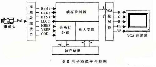 综上所述,完整的电子稳像系统结构如图8所示。摄像头输入的信号采用PAL制式,经过视频处理接口后形成RGB565格式的数字视频信号和控制信息;帧存控制器作为整个平台的核心,在将数据写入帧存储器的同时,对数字化的图像信息进行去隔行处理,再将数据读出送往VGA控制器时进行放大变换。VGA控制器则负责将数据按照VGA标准时序送往显示器上。