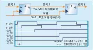 图2显示了如果抖动大于传输时间(S>P)将出现的情况,该电路用时钟的两个上升沿来延迟信号1。然而,信号1上的一个改变会在相同的时钟周期上传输到的信号3上,从而引起信号2的改变。因为S>P,电路将不能不正常。