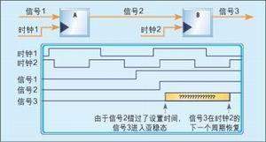 多时钟设计的最严重问题之一是用异步时钟将两级逻辑结合在一起。由于异步时钟会产生亚稳态,从而严重降低设计性能,或完全破坏设计所能实现的功能。在触发器的时序要求产生冲突时(设置时间和保持时间)将产生亚稳态,触发器的最终输出是未知的,并使整个设计处于不确定状态。如果有一级逻辑要将数据异步地发送到另一级,图3所示的情形将不能满足触发器的设置和保持时间要求。确切地说,如果设计中含有异步逻辑将有可能会产生亚稳态。在处置异步资源时必需非常小心,因为这可能产生一些很严重的问题。