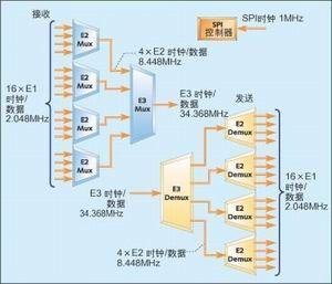 这些E1线路接口在发送和接收时都独立工作,因此2.048MHz的时钟速率可以有+/- 20ppm的偏差。同样,因为大多数系统同时发送和接收数据,分立的多路复用器和多路解复用器将提供2个独立的E3流(发送和接收)。因此,两个34.368MHz的时钟可以存在细微的差异。
