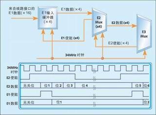 本文以电信应用中的E3多路复用/解复用设计为例。如图4所示,多路复用器接收来自一组独立线路接口芯片的16个独立E1信道,每一个信道都工作于2.048MHz;经复用后,这些E1流组合成4个E2流,分别工作在8.0448MHz;4个E2流最后组合成一个E3流,以34.368Mbps的速率串行发送出去。在接收端执行相反的操作:解复用器从E3流提取4个E2数据流,然后从E2流提取16个E1流,最终将E1流发送到接收端的线路接口芯片。