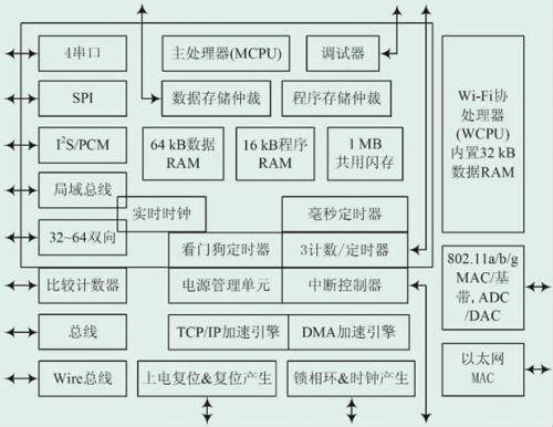 该芯片由主处理器(MCPU)、Wi-Fi协处理器(WCPU)、64KB数据RAM、16 KB 程序RAM、1MB共用内存、时钟及定时器、TCP/IP加速引擎、DMA 引擎、以太网MAC、802.11a/b/g 的无线网MAC/基带及ADC/DAC、SPI串行总线、串口、I2C总线和局域总线等组成。