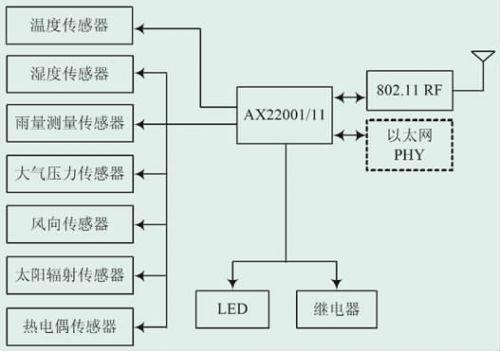 图2所示为采用AX22001/11及多种传感器设计的无线环境监测/网络传感器及遥控系统的结构框图,图中,AX22001/11通过I2C总线与温度传感器相连,湿度传感器、雨量测量传感器、大气压力传感器、风向传感器、太阳辐射传感器及热电偶传感器则通过单总线与AX22001/11相连,AX22001/11再通过通用输入输出GPIO与LED及继电器相连,从而在LED上显示传感器测得的数据,同时也可以通过Wi-Fi网络控制继电器对电路参数进行调整。