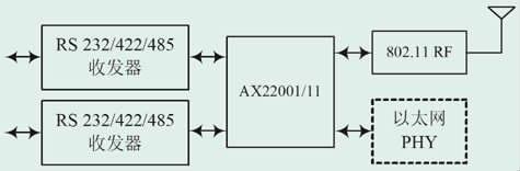 图3是采用AX22001/11设计的串行接口与Wi-Fi转换电路的系统框图,该电路可支持多种串行通信模式,包括点对点的RS 232及点对多点的RS485和RS 422总线。