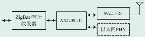 图4是采用AX22001/11设计的ZigBee/蓝牙与Wi-Fi转换电路。ZigBee/蓝牙系统可通过高速同步串行口SPI或通用异步串行口UART 与AX22001/11相连。
