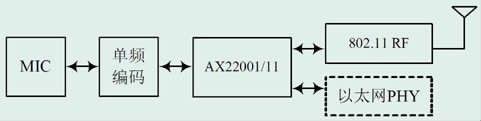 图5是通过Wi-Fi传输音频信号的电路框图,音频信号与AX22001/11相连可采用高速同步串行口SPI或I2C方式。