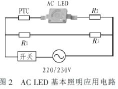 AC LED的典型应用电原理图如图2所示,它十分简单,在AC LED两端分别串入正温度系数热敏电阻PTC,和限流电阻R1、R2、R3,接上110 V或220 V交流即可进入照明工作。
