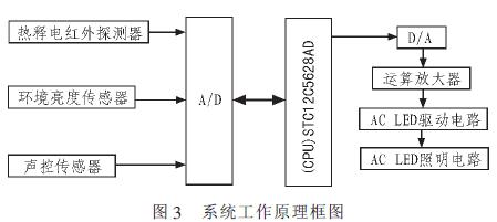 系统工作原理框图如图3所示,由热红外传感器件、强光传感器件、声控传感器件做为感知系统,传感器信号经A/D转换后传到主控器件(CPU)STC12C5628AD,经主控器件处理后将控制信号加到D/A转换电路,控制信号经放大电路放大后加到由可控硅组成的驱动电路上,由可控硅驱动电路来控制AC LED灯的开启和关断及明亮程度。