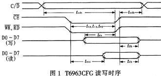 LCD接口控制信号的读写时序如图1所示。各控制信号的时序可由微控制器的通用输入输出(GPIO)接口仿真实现,例如:C/D为高电平,CE为低电平,WR为高电平以及RD为低电平时,可以从数据线上(D0~D7)读取T6963CFG的状态字。