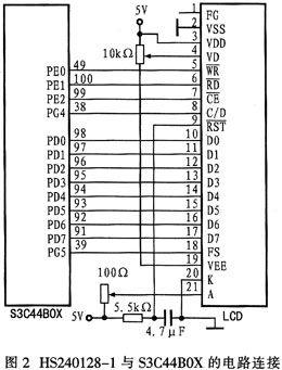 通常LCD产品都具有相应的硬件接口电路,但其类型不尽相同。带自扫描电路,可提供文本、图形和图文混合显示功能的LCD可以方便地与市场提供的嵌入式微控制器或单片机相连,如Phlips公司的LPC2104、2119等。S3C44B0X是Samsung公司提供的高性价比嵌入式片上系统解决方案,采用ARM7TDMI内核,片上集成了丰富的外围元件,特别适用于对成本和功耗敏感的应用。S3C44BOX虽然集成有LCD控制逻辑,但是,HS240128显示器的控制接口内置了控制电路,利用S3C44BOX丰富的GPIO口资源(71个),很容易实现配接。在本系统设计中选用PD0~PD7、PE0~PE2、PG4~PG5作为LCD的控制线和数据线。其电路连接如图2所示。