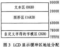 显示缓冲区可分为系统内存显示缓冲区和LCD显示缓冲区。当然,系统也可以只设置LCD显示缓冲区,程序可以只对LCD显示缓冲区进行操作。通常LCD显示缓冲区设置在I/O接口电路中,如HS240128的显示缓冲大小为32KB。根据需要,LCD显示缓冲区可以定义一个、二个或三个不同的显示区,例如:文本区、图形区和自定义字符字模区。可以自定义各区大小.如图3所示。LCD控制器可以自动将LCD显示缓冲区中文本区和图形区的显示信息向屏幕输出和刷新。屏幕的显示位置与显示缓冲区的位置具有映射对应关系。