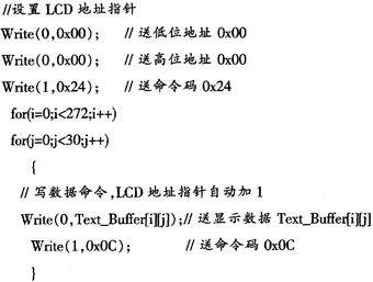 系统内存文本缓冲区与LCD文本显示缓冲区有着映射关系.其数据格式是按屏幕格式大小设定的。例如:一行30个字符对应着内存连续的30个字节。一屏(页)16行对应内存连续的480字节。如果内存文本缓冲区为8KB,可映射17页(共272行),其缓冲区设置为:Text_Buffer[272][30](行列二维数组),内存文本缓冲区中的数据传送到LCD文本缓冲区的过程可以通过下面的代码实现: