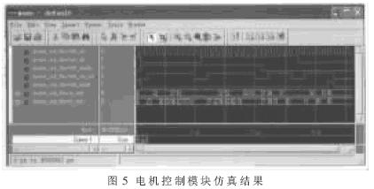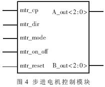 在控制模块中,mtr_cp为步进电机的脉冲输入端,每个脉冲驱动步进电机前进/后退一步,脉冲频率即为步进电机运行的速度,因此这个脉冲信号由MPU模块根据ROM内部程序的执行结果输出。mtr_dir为步进电机的正/反转切换信号,mtr_mode为步进电机全/半步运行方式选择,mtr_on_off是电机的启停位,该位置1时,mtr_cp能够驱动步进电机工作;为0时,mtr_cp脉冲被封锁。设置该位的目的是为了在多个步进电机工作时分别控制各个电机的启停而不影响到其他电机的运行状态。mtr_reset是控制模块复位信号,A_out为图3中下标为A的驱动芯片控制信号,B_out为图3中下标为B的驱动芯片的控制信号。步进电机的控制模块的仿真波形图如图5所示。从图5可以看出,仿真波形完全符合图2中步进电机的驱动时序,即控制模块的设计满足预定的设计需求。