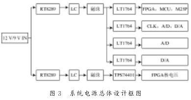 系统电源在整个系统中占有极其重要的地位,其设计的成功与否关系到整个系统能否稳定运行以及性能表现的好坏。由于本系统电平值比较多,同时基于系统性能、功耗的考虑,故采用以下方案给整个系统供电。系统电源总体设计框图如图3所示。