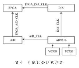 TCXO为AD9516提供10 MHz的参考时钟,VCXO为AD9516提供122.88MHz的外部时钟,VCXO与TCXO保持相位同步,AD9516为A/D提供122.88 MHz的差分时钟A/D_CLK,A/D在时钟A/D_CLK下进行采样;AD9516为D/A提供122.88 MHz的差分时钟D/A_CLK,D/A在时钟D/A_CLK下进行数模转换;A/D提供时钟FPGA_A/D_CLK给FPGA,A/D在此时钟下传送数字信号给FPGA;D/A提供时钟FPGA_D/A_CLK给FPGA,D/A在此时钟下从FPGA接收数字信号。