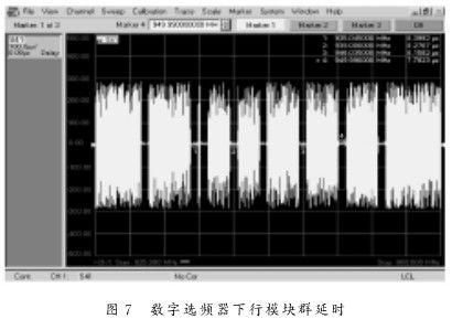 从图6可以看出,该数字选频器能够实现比较好的选频功能,被选出的有效相邻信道之间最小间隔能达到1 MHz;从图7可以看出该系统的群延时比较小,表明设计的滤波器性能较好,信号失真较小,系统实时性较好,能够满足实际应用的要求。
