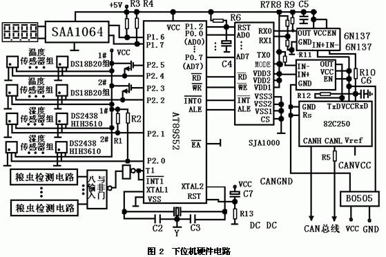 上位管理机采用PC机,主要完成整个监测网络系统的参数设置、粮库的状态查询、数据处理、粮情分析、超限实时报警和报表打印等功能。下位智能节点由单片机、数据采集电路和CAN通控制驱动电路构成。