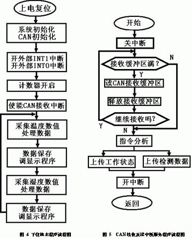 下位机的软件由下位机主程序、温度采集程序、湿度采集程序、粮虫检测中断程序和CAN收发中断服务程序等构成。由于篇幅所限这里仅给出了下位机主程序和CAN通信中断服务程序的流程图,分别如图4和图5所示。在下位机主程序里,系统要首先进行单片机的初始化、CAN的初始化、开外部中断、开启计数器和使能CAN接收中断的过程,是系统处于就绪状态,然后调用数据采集程序和数据处理程序,实时采集粮库现场的参数并予以处理,处理后的数据要保存起来供上位机随时查询,同时送显示器显示。
