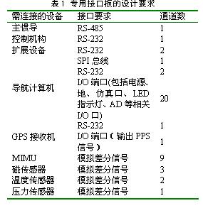 低成本MIMU/MR/GPS组合导航系统的结构框图如图1所示,从图中可以地看到,系统内部各个分机设备以及系统外部相关设备的接口各不相同而且传输协议也有差异:OEM板使用RS-232异步串***换数据;导航计算机通过SPI总线进行数据传输;MIMU、磁传感器、温度传感器和压力传感器等直接输出模拟差分信号;系统则通过RS-485和RS-232与系统外设备进行通讯。这些设备之间不能够直接进行数据传输,因而要求研制一种专用接口板,在各种设备间架起一座通讯的“桥梁”,对接口板的各项要求参见表1。