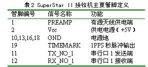 本系统采用的GPS接收机是NovAtel公司的SuperStar II GPS-OEM板,它采用RS-232异步串行口(波特率范围在300Hz到38.4KHz)通过报文的形式与外部设备进行信息的交换并对其控制。SuperStar II GPS-OEM接收机具有20针的接口端子,设计中使用部分的管脚定义如表2所示。