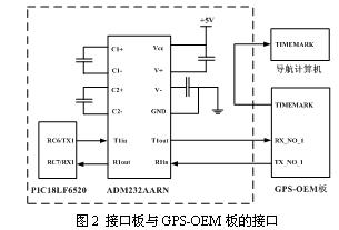 接口板与GPS接收机接口的主要作用是接收GPS数据,并向GPS接收机发送控制指令。主要通过接口板上的PIC18LF6520来实现。