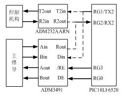 在实际应用中,低成本的MIMU/MR/GPS组合导航系统需要从主惯导传送初始化数据和初始对准数据,由于通常传输距离较远,为保证数据传送的可靠性,采用RS-485/422通信协议。初始化完成后,该端口可用于向控制机构传递经过运算后的导航参数,这时距离较近,可采用RS-232通信协议。本设计中采用PIC18LF6520、ADM232AARN和ADM3491芯片并辅以少量其它电路,仅需要通过对相应管脚进行编程控制,方便地实现了RS-232/485/422多协议异步串口,实现导航处理器与主惯导或控制机构的数据通信。