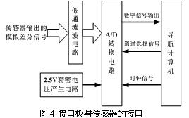 ADS1254E芯片的精密参考电压输入管脚接入2.5V,由接口板上一个2.5V的精密电压产生模块供给。ADS1254E有4路差分数据输入通道,而每次仅能串行输出1路通道的转换结果,切换通道的控制信号由导航计算机提供。另外,ADS1254E还需要2路时钟信号,即采样时钟信号和串行输出时钟信号,4片ADS1254E的时钟信号严格同步,均由导航计算机提供。详细的硬件结构图参见图4。
