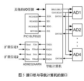 PIC18LF6520与导航计算机通过SPI总线通讯,利用PIC18LF6520的MSSP模块来实现。PIC18LF6520的MSSP模块可以工作在两种模式,即SPI模式和I2C模式,本设计中使用SPI工作模式,需要复用单片机的RC3、RC4、RC5和RF7管脚;导航计算机需要为模数转换电路中的AD芯片提供2路时钟信号、2路通道选择信号,并且接收4路数字串行输出信号;最后,导航计算机和接口板之间还留有2个UART扩展端口,为以后的系统升级提供了方便。硬件结构图参见图5,需要注意的是SEL0、SEL1是AD芯片的通道选择信号,4片AD芯片的通道选择信号相同,CLK、SCLK分别是AD芯片的采样时钟信号和串行数据输出时钟信号,4片AD的时钟同步。