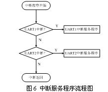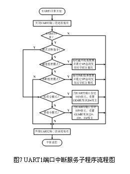 如果是UART1端口的中断,则程序跳转到UART1的中断服务子程序中来。UART1端口负责接收上位机的指令,控制切换整个系统的工作模式,并且根据需要设定系统的参数。程序流程图参见图7。