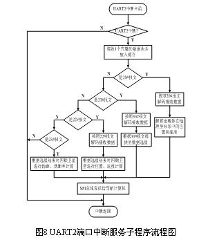 如果是UART2端口的中断,则程序跳转到UART2的中断服务子程序中来。UART2端口主要是根据当前的工作模式,响应OEM板GPS数据的中断,实时采集OEM接收板串行输出的导航电文,同时完成电文的解码。具体执行流程图参见图8。